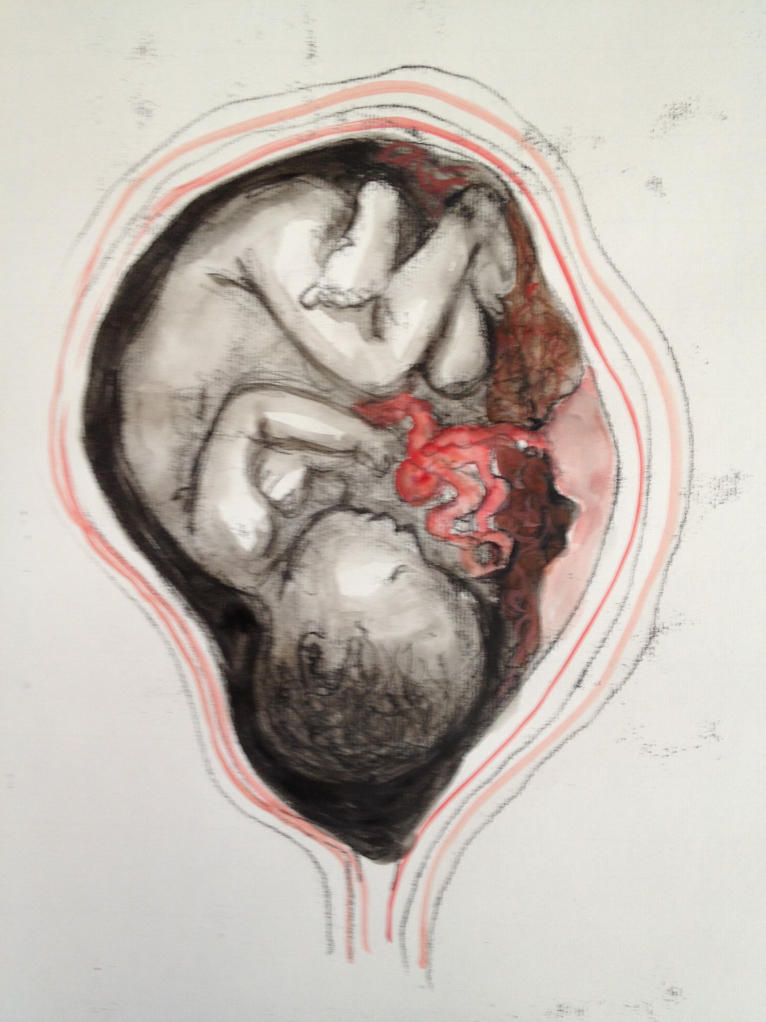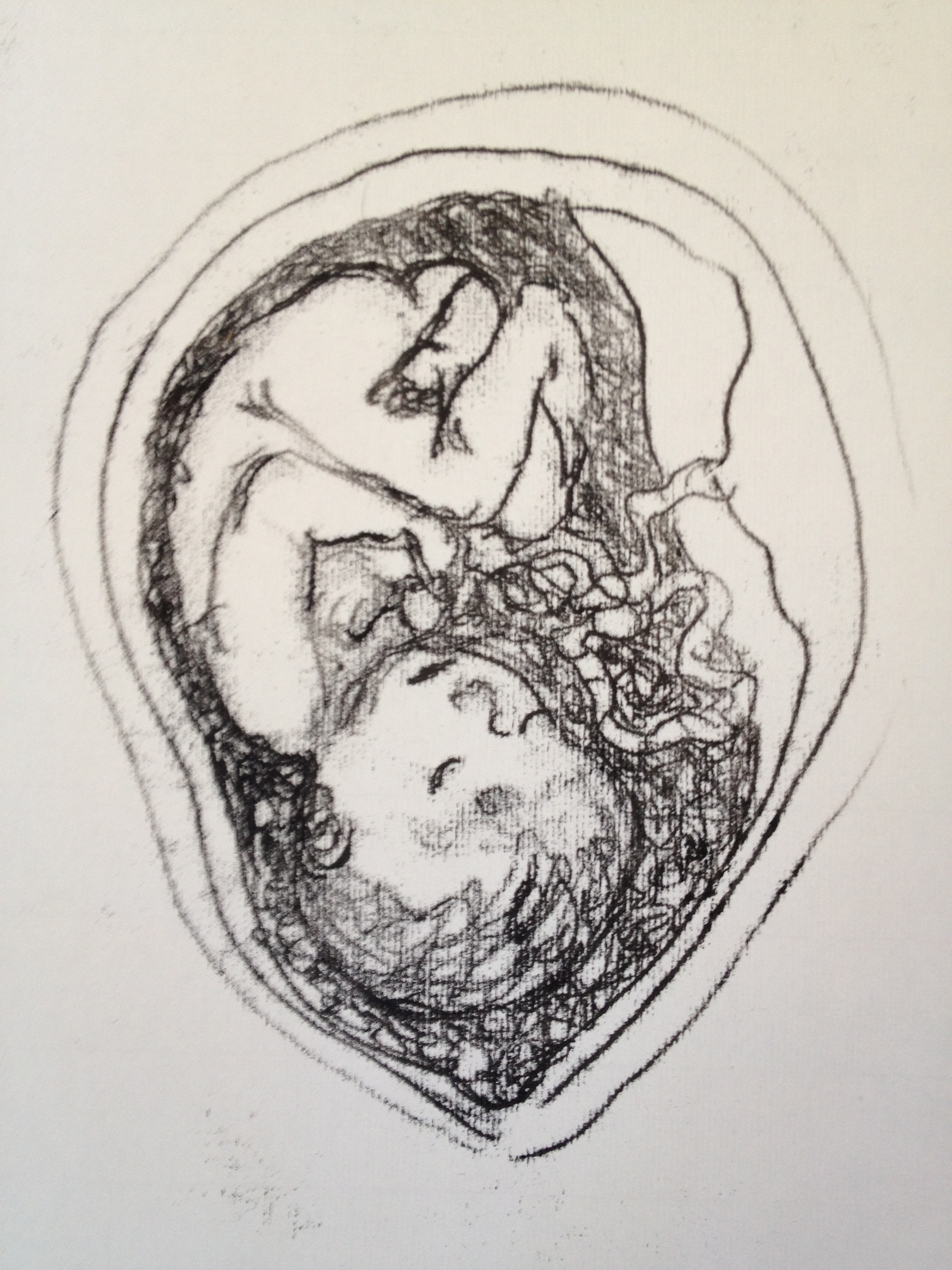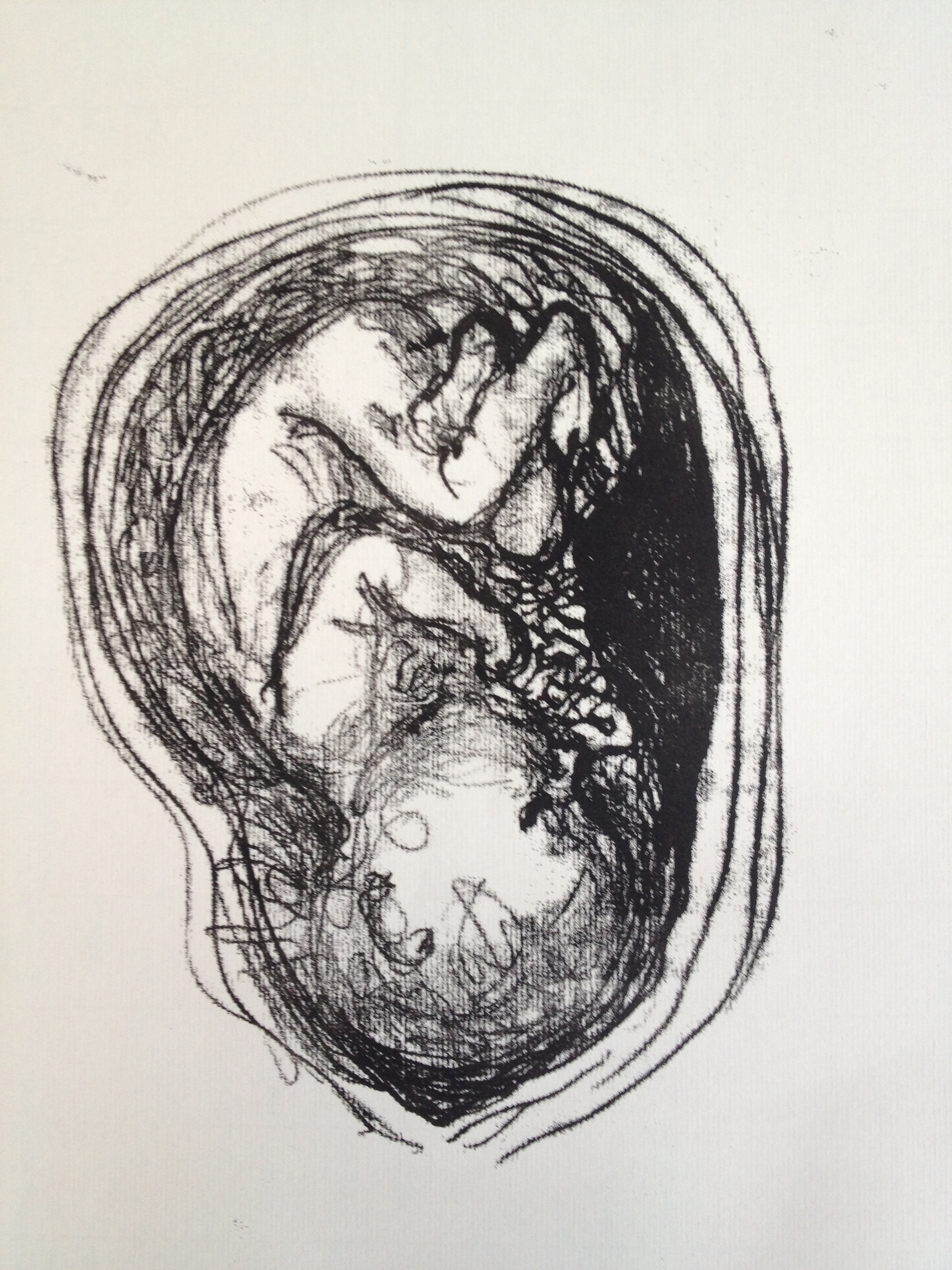 But there were quite a few others. As I got used to drawing babies in the womb, they got too realistic, and then they got too cute, and always with this kind of monotype it is a very tricky thing to manage the amount of ink and how light or dark they come out so many were either too light or too dark and blotchy. And sometimes, the pencil drawing on the back of the page was better than the monotype on the front of the page, until I had to do the smudging to add tone, and then the pencil drawing got smudged.