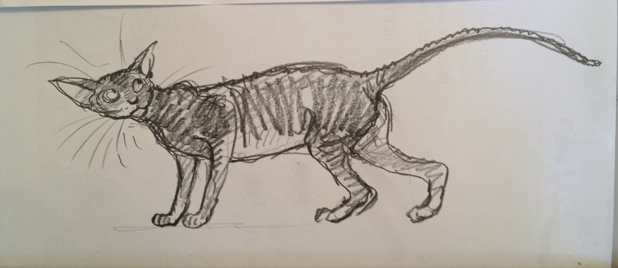 I’m revising roughs on the run. This puddy was a Maine Coon in the rough and needed converting to Rex before inking.