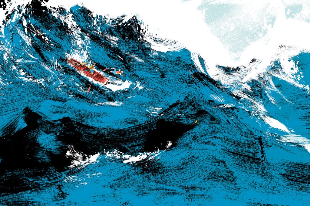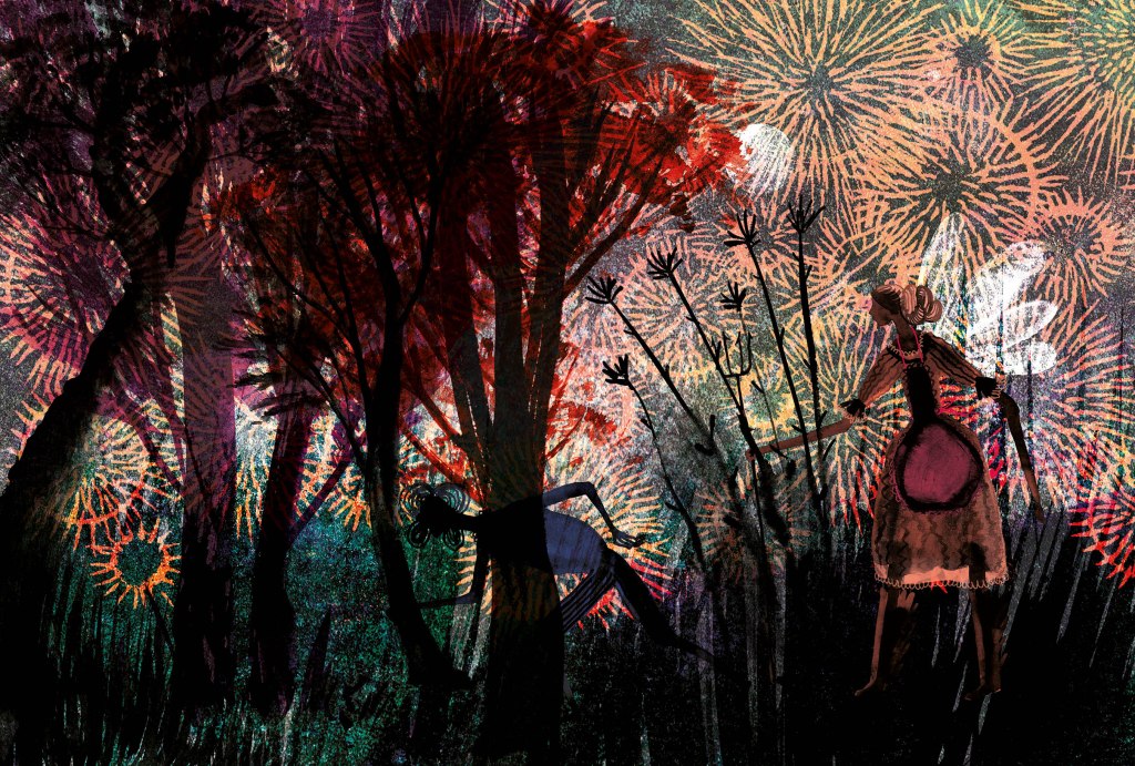 illustration created using paint, pencil, hand-printed texture, monotype and digital colour.