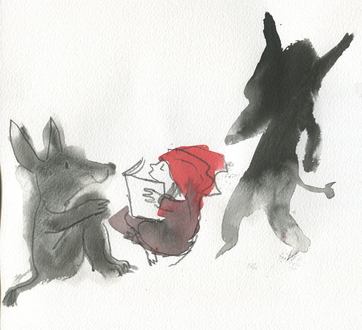 Ann James’ Red Riding Hood and Friend Wolf (with mysterious dark figure looming behind!) © Ann James 2015