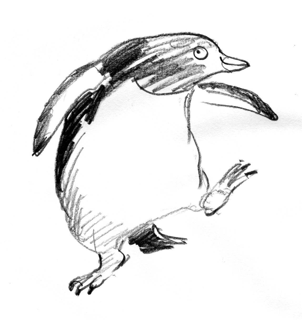 He’s retreating, so he’s best drawn partly from behind. The fluffed up hunched shoulders, I mentioned earlier. He should look clumsy, so I experimented with leg postures. He has just alighted so I need to suggest the flight just finished. And he’s walking away and downwards, so I have to suggest the forward downwards movement as well.