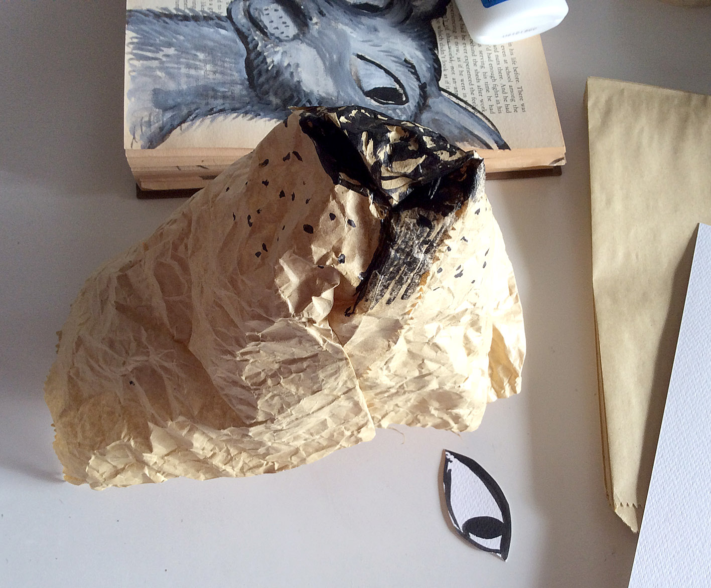 I am always attracted to working with paper, especially if it’s not pure white and pristine. Paper is forgiving and fixable and as my approach has by choice a rough-finished aesthetic, many tearings and glueings would not matter. I have also always loved the floppy, rough expressive quality of an ordinary sock puppet, that comes to life in the hand of anyone, no matter how young. My vague thought was that the puppet would be a crumpled paper sock-puppet with personality rather than anything else.