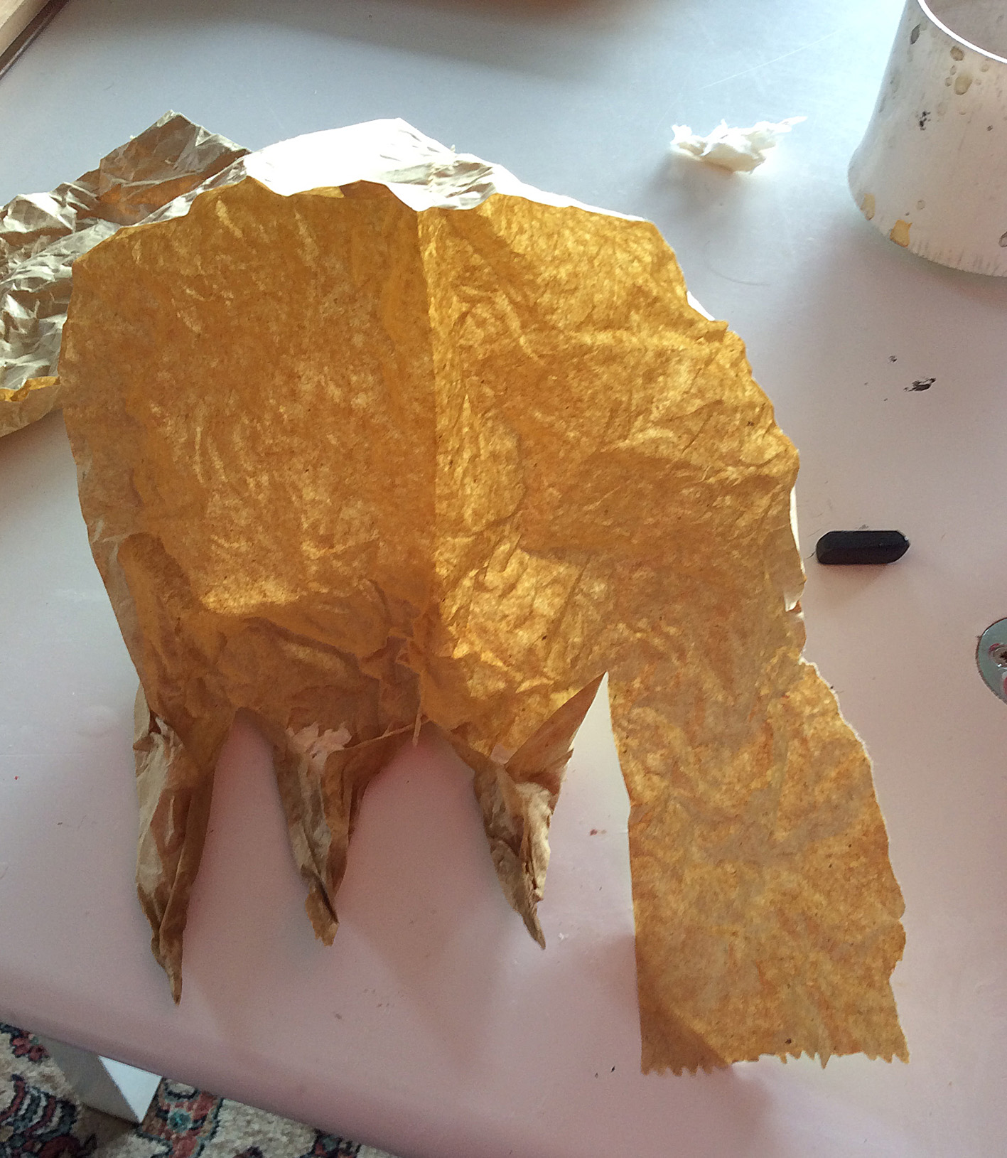 The strut did work partly. Here it is holding the width of the head roughly in shape but she still had no brow and no narrowing muzzle. I’m aware that anything can be fixed with cutting or tearing and re-gluing, but it will all be pretty random, as I don’t have pattern making skills!