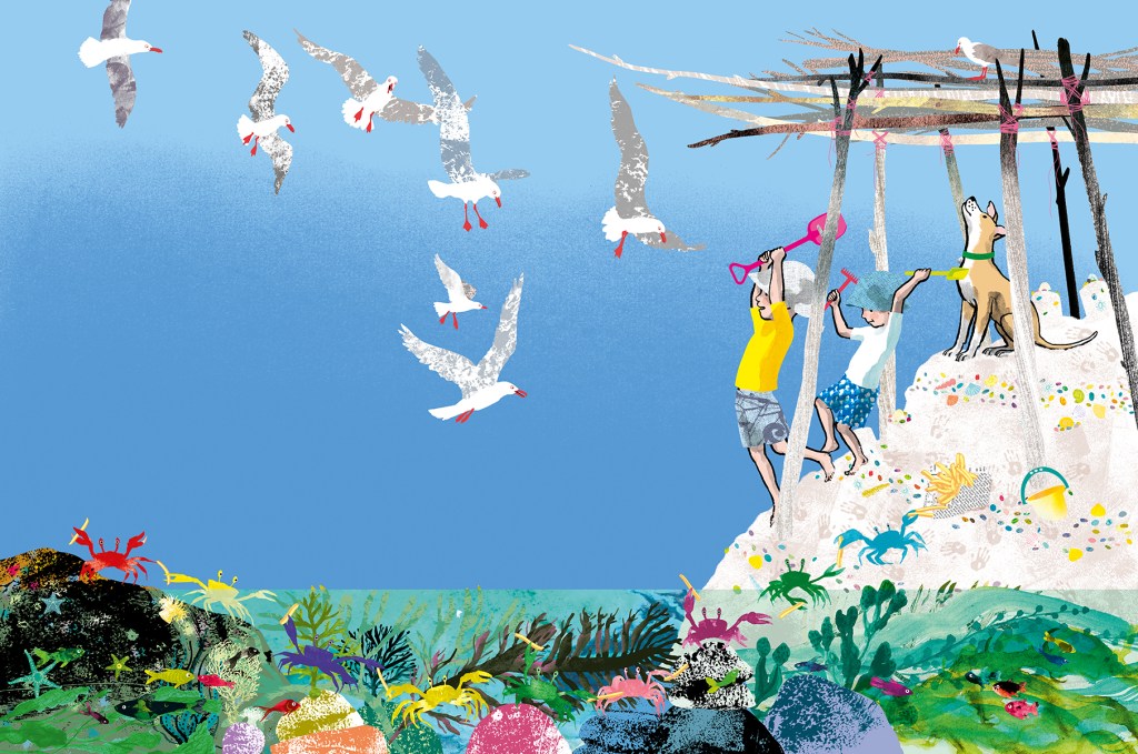 The opening pages, though brightly coloured, are deliberately minimalist, taking a Less is More approach. I needed to create a contrast between the real world and the imagination. But the adventure scenes underwent a process that was a bit like filling up a bucket until it began to overflow, then taking bits out. I added elements and colour layers until the illustration began to lose its cohesion or focus and became ‘too much’. then I peeled away elements strategically until I felt I had captured the right balance of More is More.